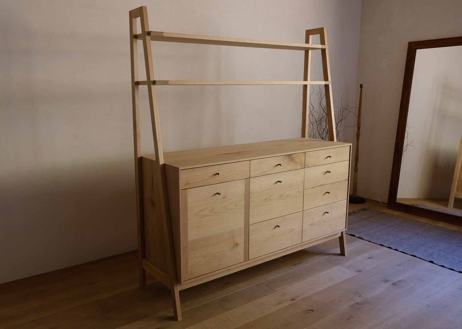 食器や家電、鍋やストックのものを収納するために、どこに配置するかを想定しそれぞれの高さを決めた。頻度の高いものは上側に、時々使うものは引き出しの下側に配置。生活の中での使いやすさとは…と自問しながら、機能はもちろん魅力的な家具になるよう検討を重ねた。季節によって入る光の違いで、クルミ材の表情がこんなに豊かであることに初めて気が付いた。使い勝手はもちろん、木の魅力が最大限感じられる家具に仕上がった。